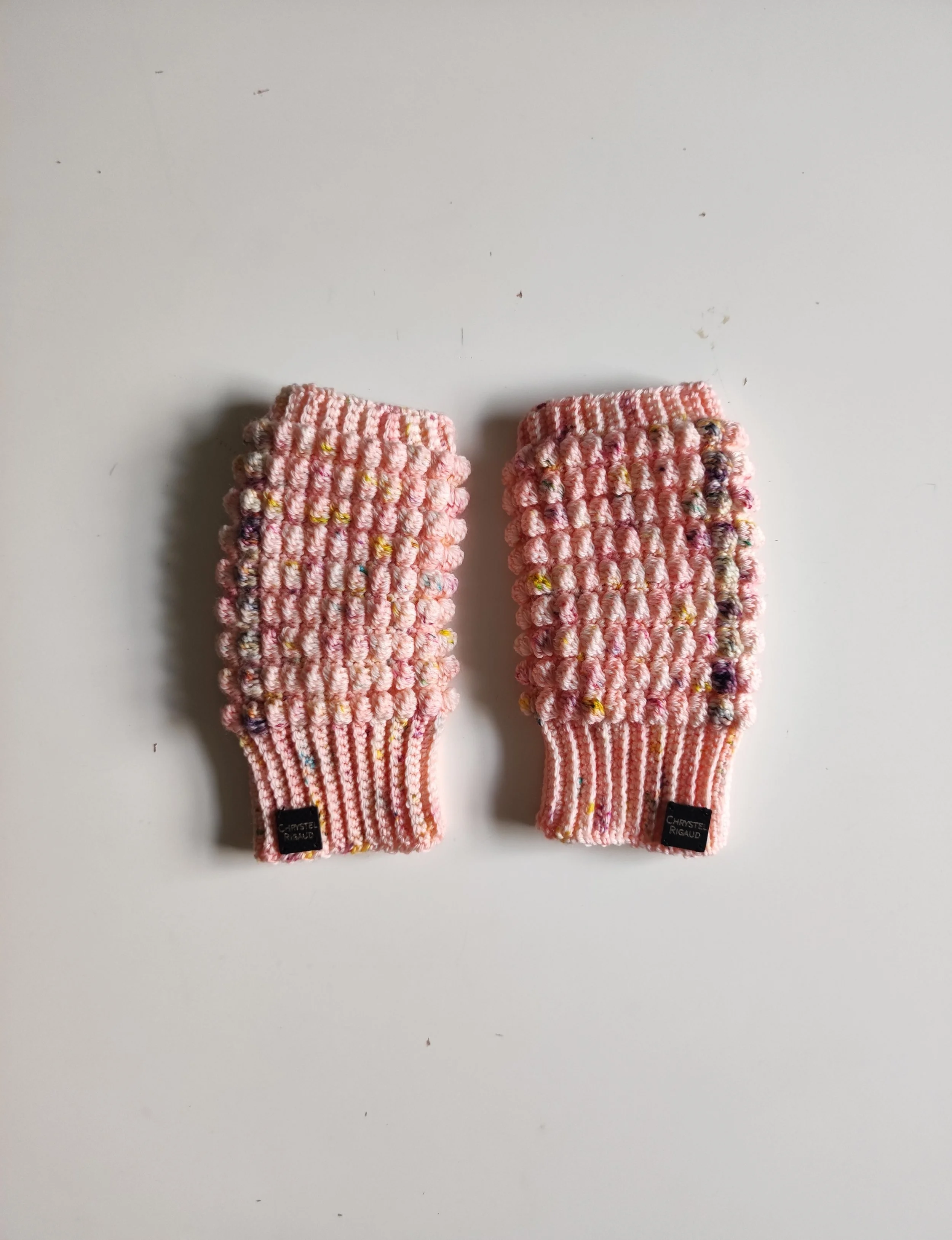 Crochet handwarmer in soft pink.